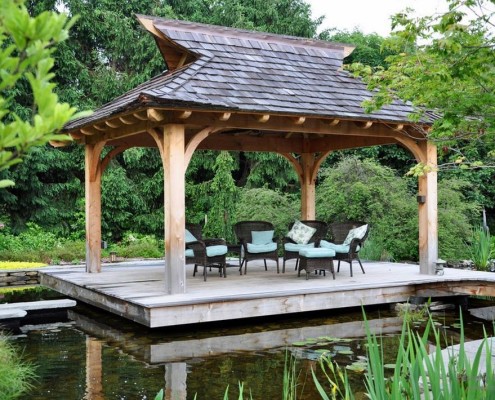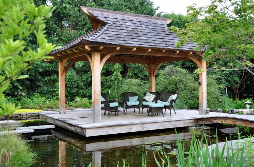 Место беседки рядом с искусственным водоёмом – одно из самых удачных решений