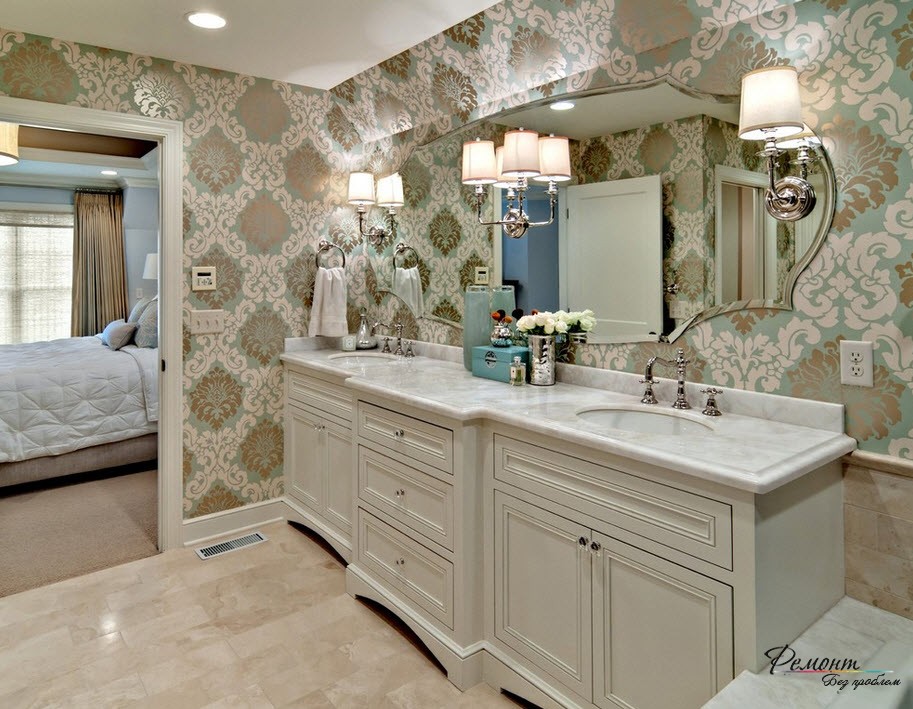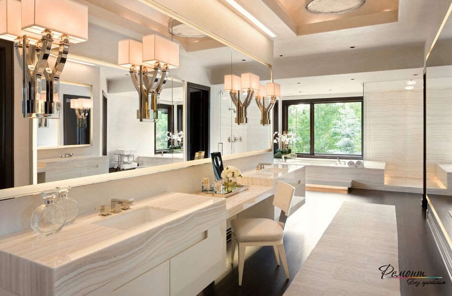 Отличным дополнением к верхнему освещению в ванной комнате станут бра, размещенные по обе стороны зеркала. Такой ансамбль светильников при надобности заполнить все помещение ярким светом или же создать уютную, практически интимную атмосферу.