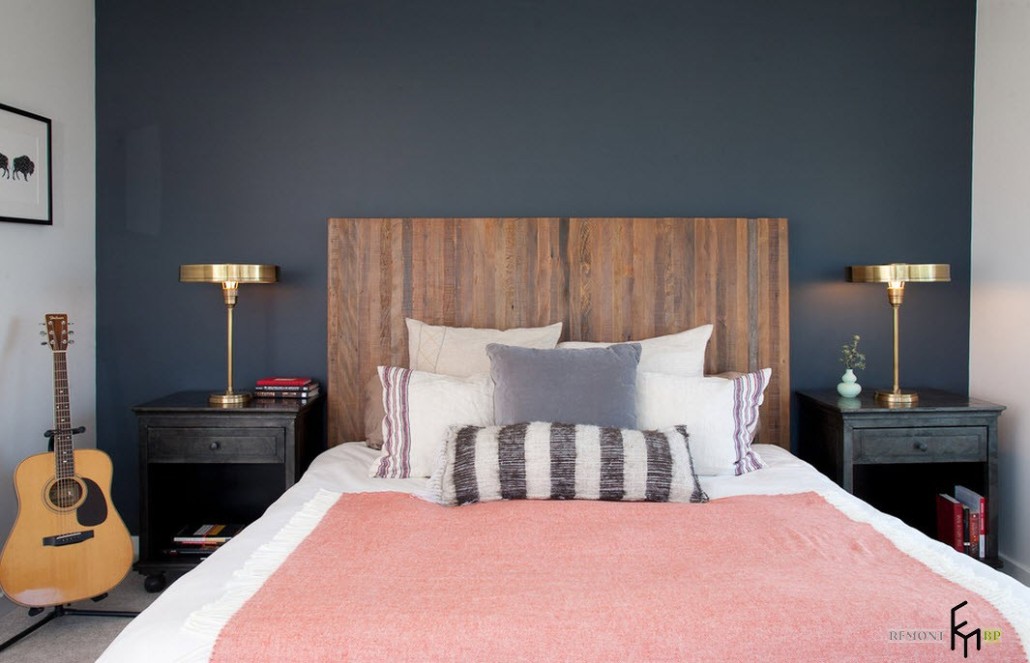 Если в конструкции кровати отсутствует спинка-подголовье, вместо нее можно оформить акцентную стену, просто покрасив ее краской контрастного цвета: