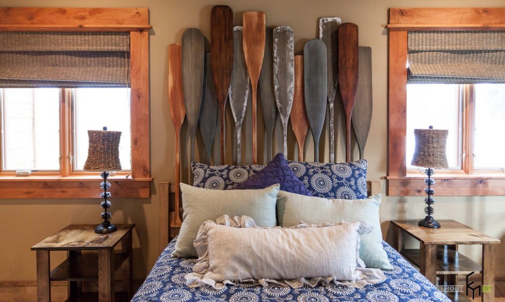 Если вы не боитесь смелых экспериментов, в изголовье кровати можно прикрепить самые неожиданные предметы. Например, лодочные весла. Разные по форме, размеру, цвету, фактуре, такие аксессуары, несомненно, станут центром внимания в спальне. Благодаря спокойной нейтральной расцветке это необычное изголовье не мешает вашему отдыху. Подобрав другие предметы декора в природном стиле, вы создадите в спальне уютную теплую атмосферу рыбацкой деревни: