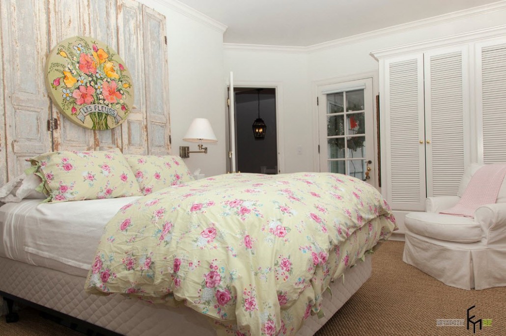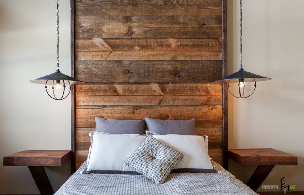 В спальне с традициями кантри экстравагантно будет выглядеть изголовье в форме дверей из брашированных досок. За дверями могут быть скрыты полки в нише: