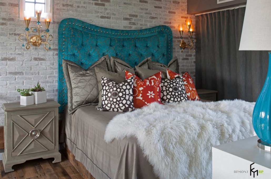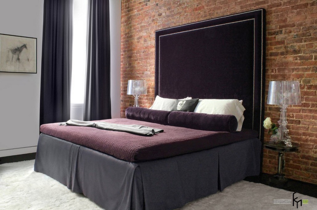 На фоне кирпичной стены строгое изголовье в классическом стиле создаст восхитительную обстановку. Для создания контраста можно использовать не только цвета, но и материалы. Так, кирпич как твердый холодный материал подчеркнет мягкость и изящество велюра: