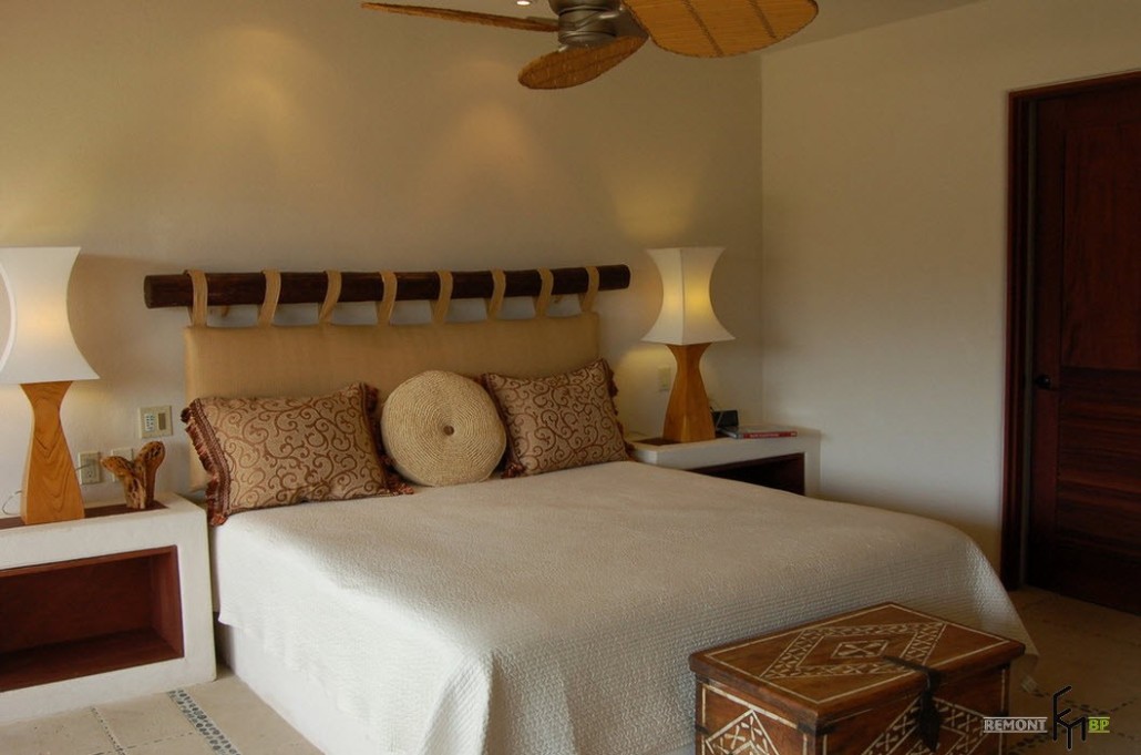 В стиле этно очень много различных направлений. Изголовье с вычурными резными узорами в восточном стиле в совокупности с соответствующими аксессуарами создадут особый национальный колорит в спальне: