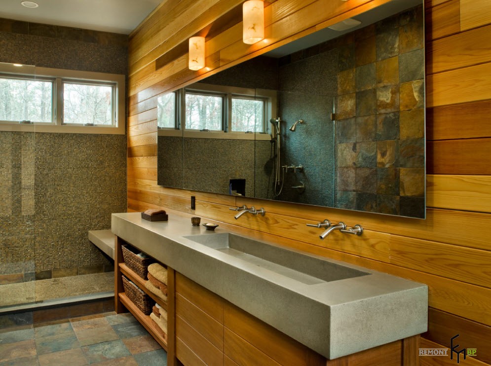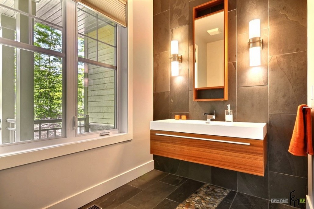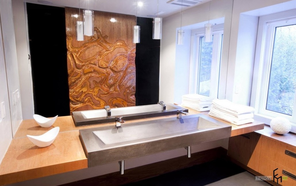Очень необычно смотрятся в интерьере встраиваемые раковины-водопады. Такая конструкция мини-водопада сложнее в установке, но создаст неповторимый акцент в интерьере ванной: