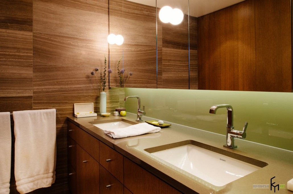 Фасады на мебели для ванной также могут имитировать мрамор. Очень эффектно смотрятся такие конструкции в минималистических стилях. Глянцевая поверхность не уменьшает пространство: