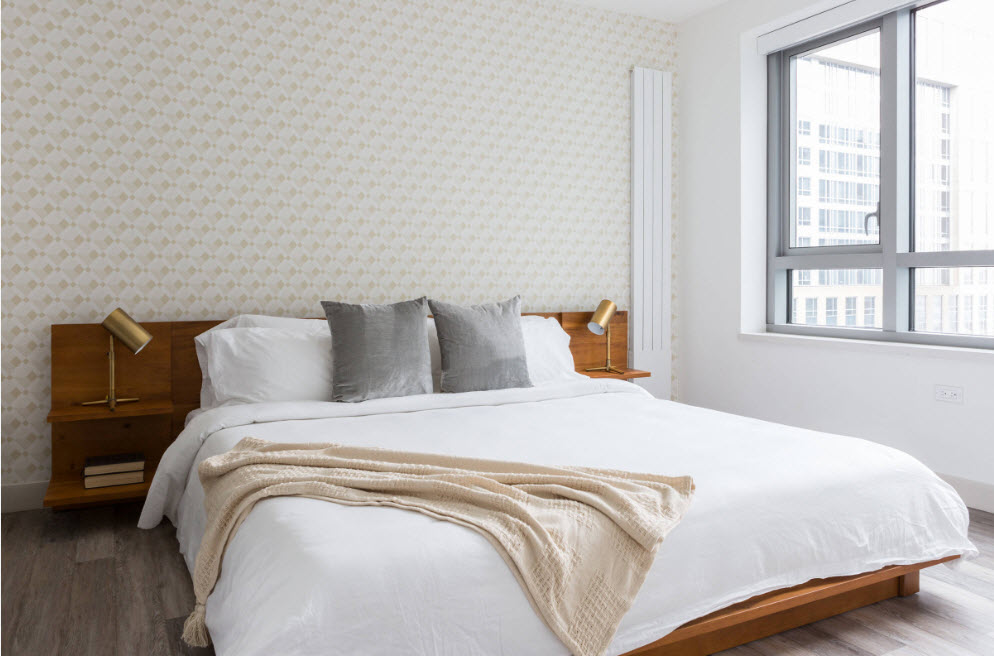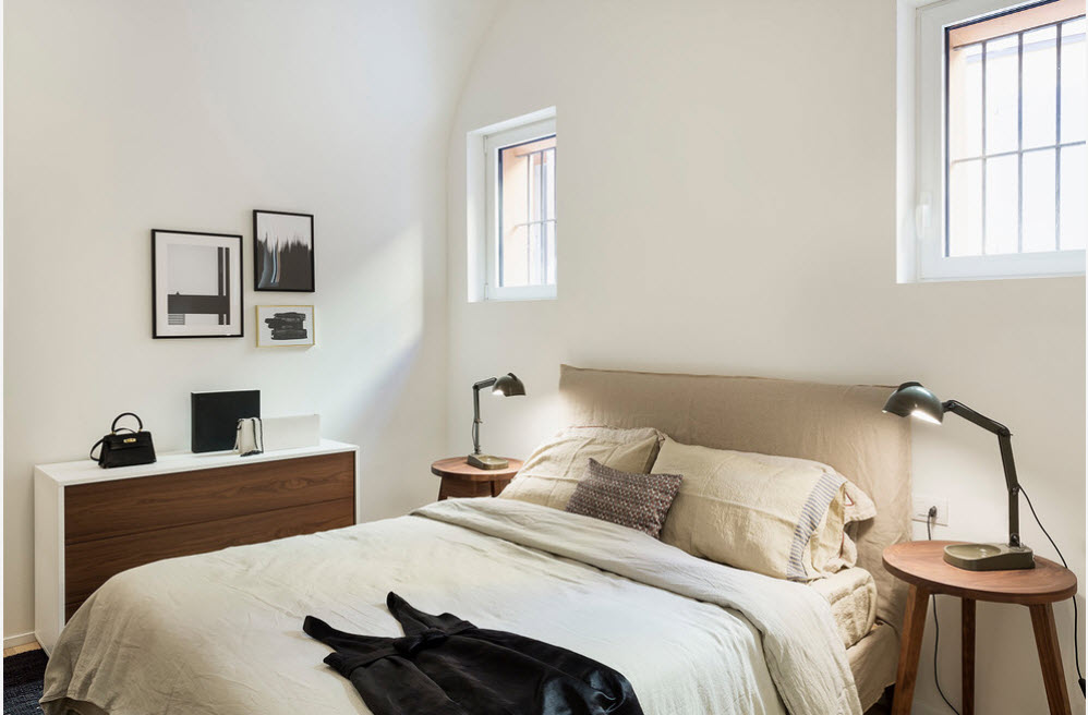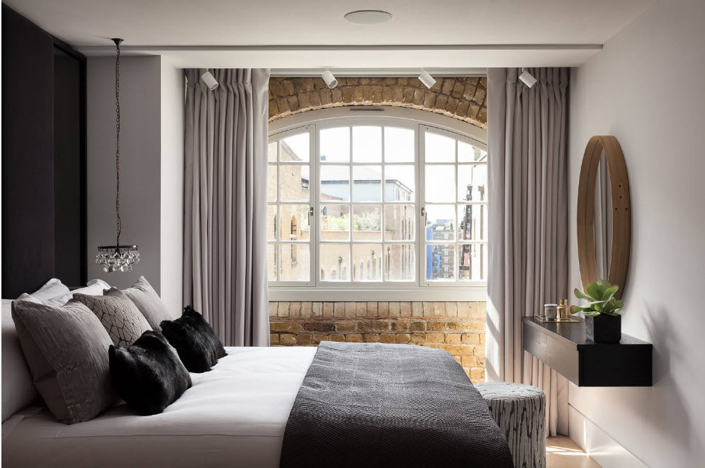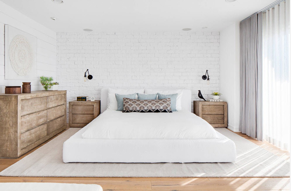 На использование в собственной спальне промышленных элементов не каждый согласится, но, зачастую, достаточно одной акцентной стены с кирпичной кладкой, чтобы привнести изюминку в современный интерьер. Если кирпичная кладка в своем естественном обличии – слишком смелый ход для вас, можно снизить уровень индустриальности и покрыть фактурную поверхность светлой водоэмульсионной краской. Для гармоничного завершения образа достаточно будет использовать светильники, выполненные в индустриальном ключе (с металлическими плафонами или вовсе без них).