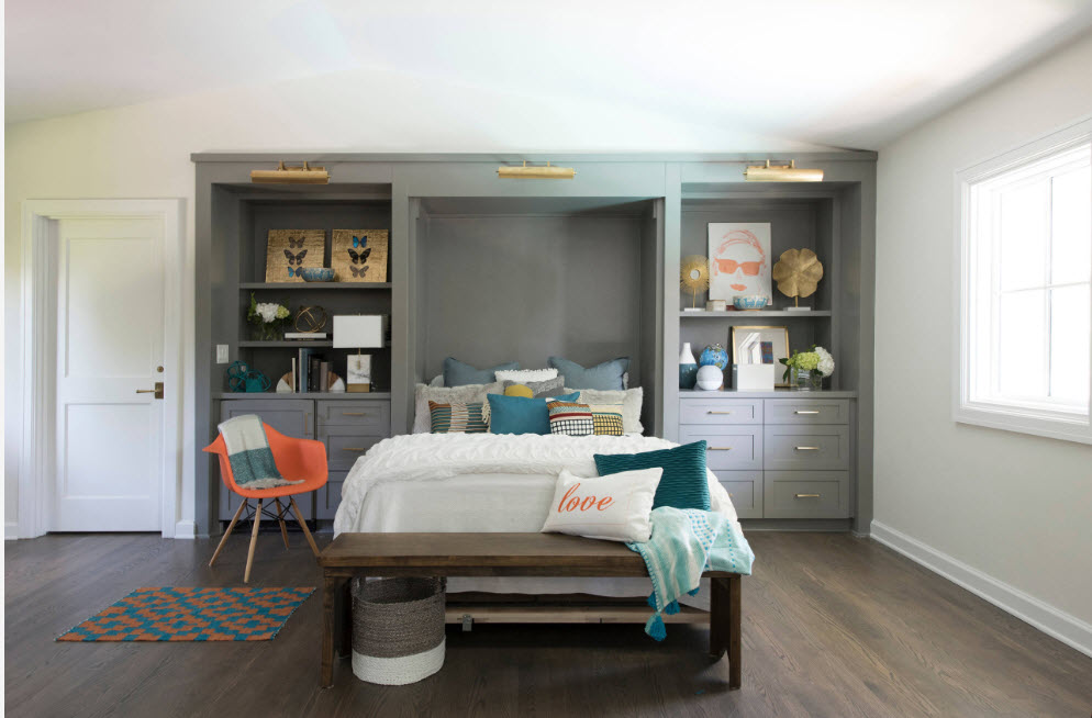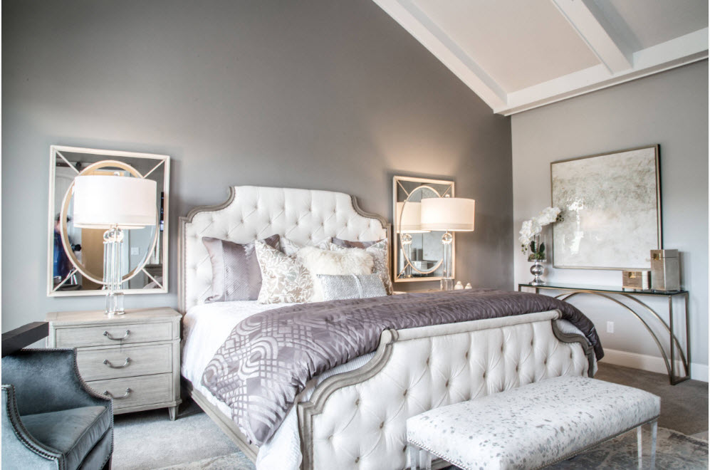 Еще один не менее популярный универсальный цвет с широкой палитрой его оттенков – серый. Нейтральные, но при этом благородные оттенки отлично подходят для того, чтобы создать в помещении спальни спокойную, расслабляющую атмосферу. Серый цвет в отделке несложно сочетать с другими цветовыми решениями мебели и декора. Перемежая серые поверхности белым цветом и предмета интерьера, сделанными из древесины (любой породы) можно достичь интересных результатов. При этом создается образ помещения, в котором будет комфортно каждому. Ну а создать цветовой акцент в спальне серого цвета не составит труда – достаточно любой яркой детали.