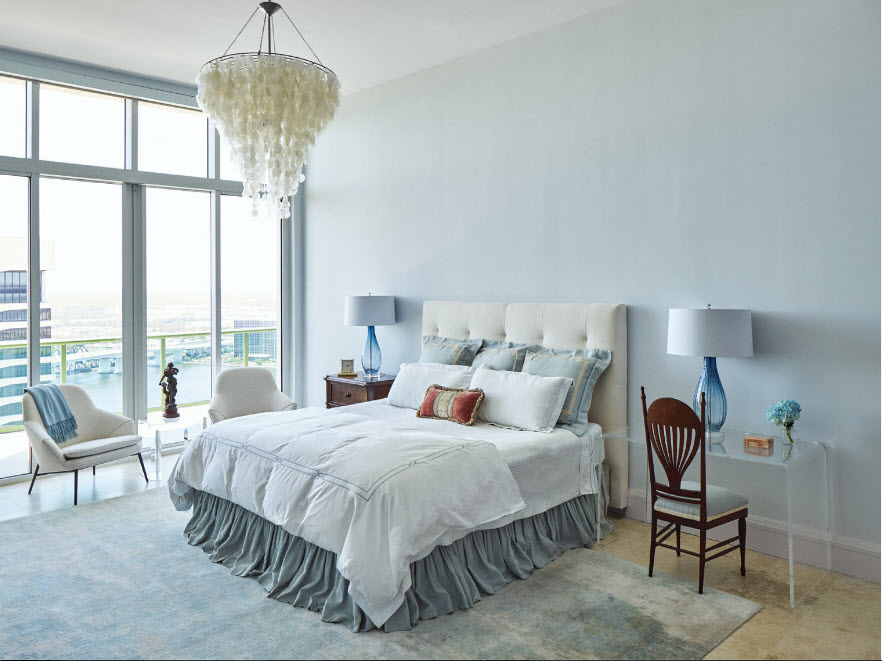 Учитывая минималистские мотивы современной стилистики, декоративные элементы из интерьера спальни исчезают вовсе или сводятся к минимуму. В качестве украшения используются вполне практичные предметы дизайна помещения, например, осветительные приборы. Центральная люстра способна не только выполнять основные функции по освещению пространства, но и украсить его, стать изюминкой интерьера. Учитывая тот факт, что ни одна спальня, даже самых скромных размеров, не обходится одним лишь подвесным светильником, декоративными элементами могут выступать и настенные бра или настольные лампы, напольный торшер – все зависит от того, каким образом организована подсветка мест для чтения или подготовки ко сну в вашей комнате.