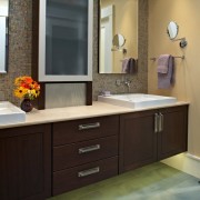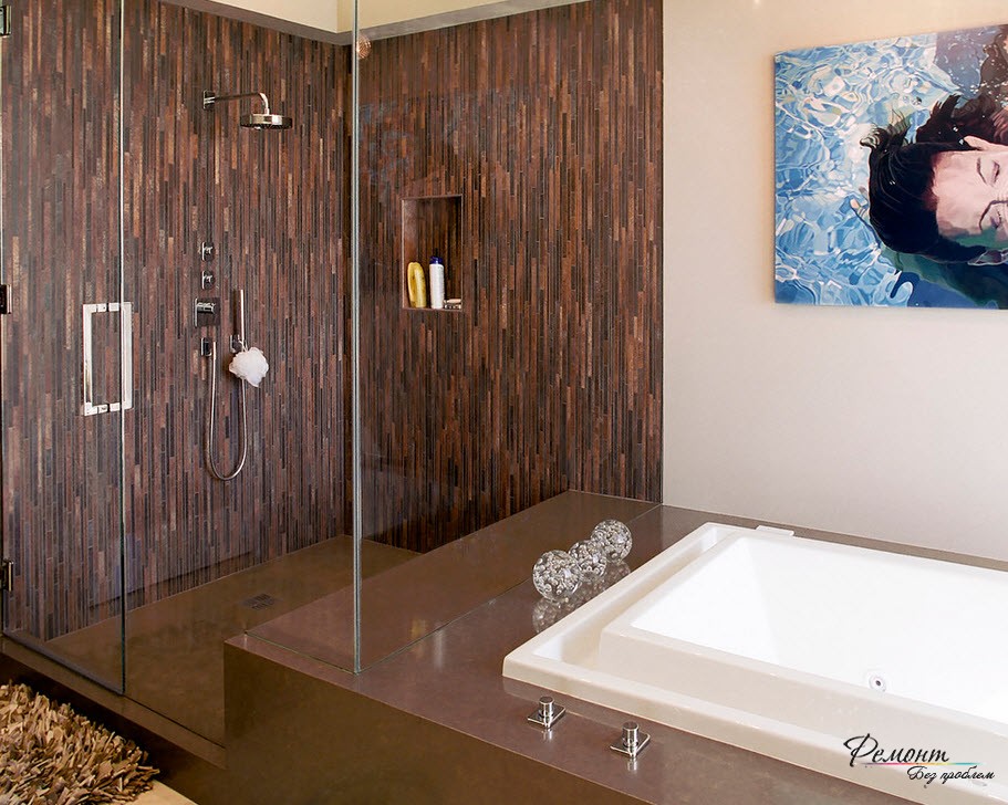 Необычным способом оформления интерьера ванной комнаты является мозаика. Таким выбором будет обеспечена уникальность дизайна помещения. При этом совершенно не важно, будут ли элементы рисунка крупными или мелкими. Материал тоже не имеет особого значения. Выбрать можно стекло, плитку, камень и другие материалы. Использовать можно как отдельные детали для создания своего узора, так и готовые панно, приклеенные заранее на полимерную основу.