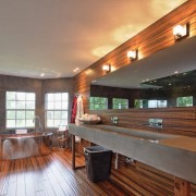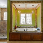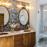 Теперь ванную комнату можно украсить любой разновидностью декоративного материала. Главное, чтобы у него был особенный состав, который позволит таким обоям или даже деревянному покрытию выдерживать агрессивную среду ванной комнаты.