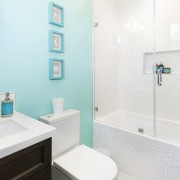 Еще один классический и недорогой способ оформления ванной комнаты – это окрашивание стен водостойкой краской. К подходящим разновидностям относятся латексные краски. Помимо влагоотталкивающих свойств, этот продукт еще и устойчив к жирам и другим загрязнениям.