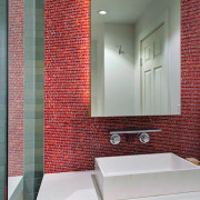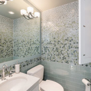 Для создания оригинального интерьера можно одну из свободных стен в ванной комнате выложить плиткой с разнообразными узорами, создав на стене рисунок по типу лоскутного шитья. Однако при таком выразительном декоре оставшиеся поверхности следует сделать однотонными, чтобы не перегрузить пространство.