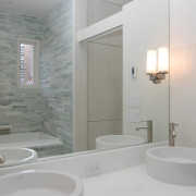 Для отделки большой ванной комнаты можно использовать несколько видов отделки для разграничения пространства. К примеру, в душевой кабине стены выложить плиткой мозаикой, а возле ванной сделать панели с элементами мозаики.