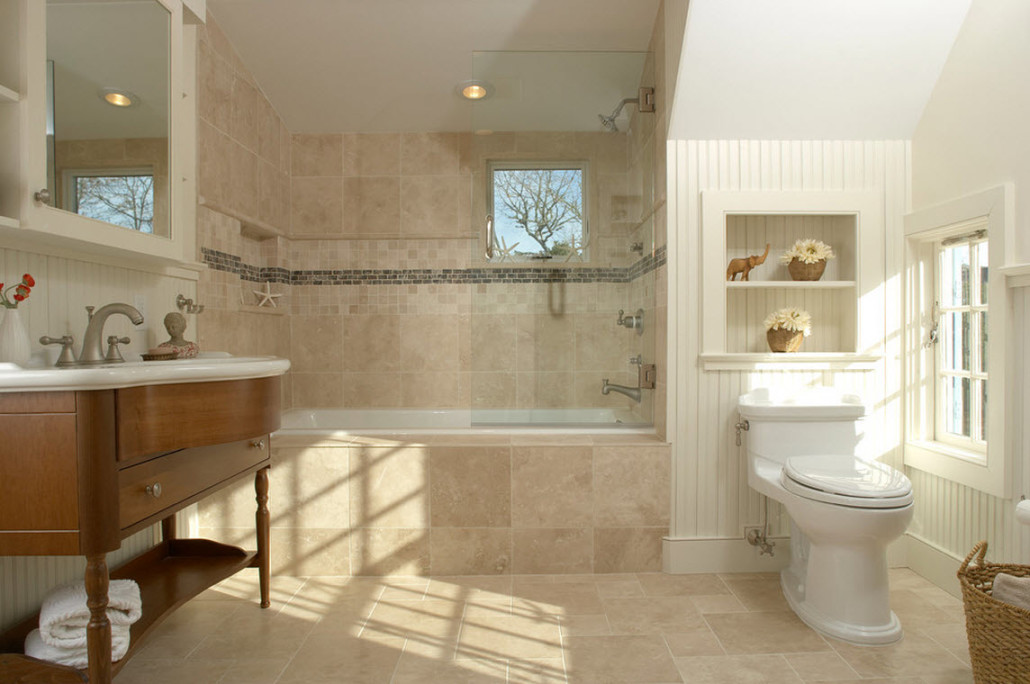 Оригинальным решение для дизайна ванной станет сочетание теплого бежевого оттенка с насыщенным цветом темного шоколада. Для создания такого интерьера ванную можно поместить в специальный короб, выложенный шоколадной плиткой, такую же отделку применить и в области душа, а чтобы вода не брызгала на пол установить стеклянные стенные перегородки. В дополнение к плитке можно подобрать большую тумбу умывальник с многочисленными ящичками для моющих средств и прочих мелочей. Свободные тены в такой ванной окрасить в теплый бежевый цвет и заполнить пустое пространство картинами, которые станут объединяющими элементами для использованных контрастных цветов.