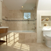 Второй, не менее интересный вариант – панели из плитки. В таком случаю оставшуюся часть стены покрывают слоем специальной влагостойкой штукатуркой. Не менее интересно в отделке стен ванной комнаты смотрится плитка под натуральный камень.