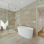 Превосходно в ванной комнате будет смотреться глянцевая плитка. Она визуально расширит пространство и сделает его глубоким. Такой плиткой можно выложить стену, вдоль которой расположить ванную и душевую стойку.