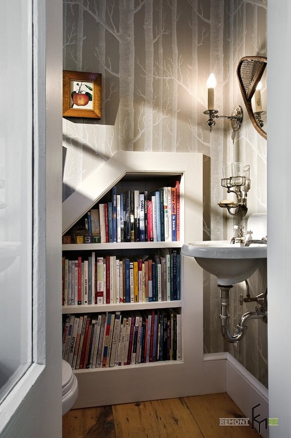Красочного разнообразия добавляют яркие гигиенические и текстильные предметы, пестрый фриз из стеклянной мозаики по углам или по периметру. Панно на всю стену создаст определенное настроение. Тему комфорта закончат книжные полки. Восседая на троне, не по-королевски тратить время впустую.