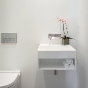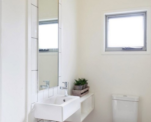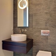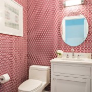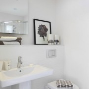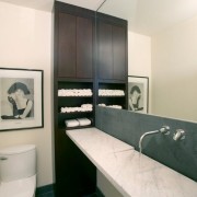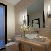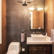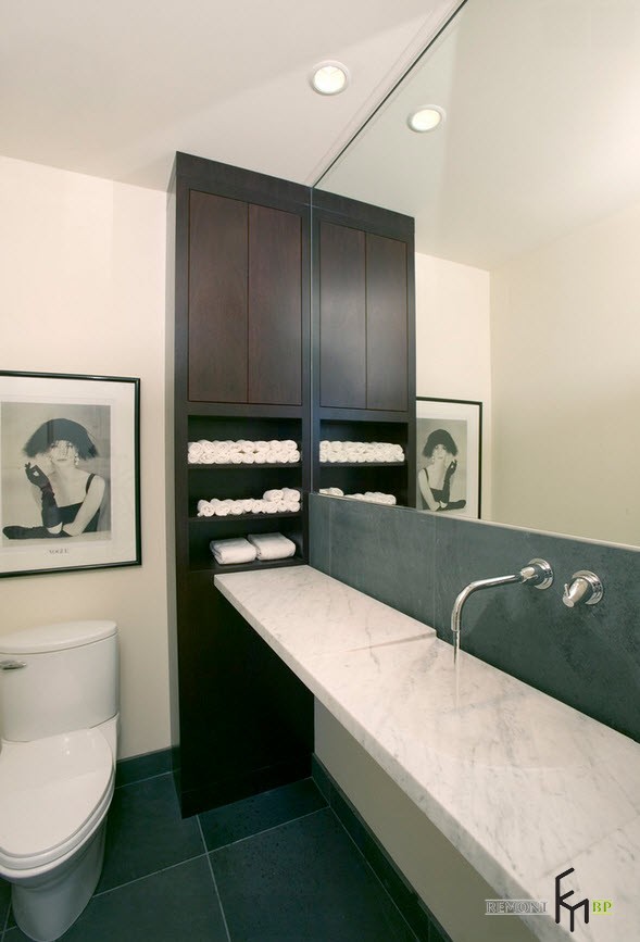 В противоположность английскому шику – актуальный минимализм, не зацикленный на деталях и строгом перечне необходимых аксессуаров для антуража. Практичное обустройство призвано создать комфорт без излишеств. Приветствуются приглушенные цвета, гладкие панели, четкие линии. Вполне достаточно присутствия в туалете зеркала без рамы, фаянсового унитаза и умывальника с округленными углами.