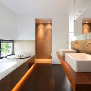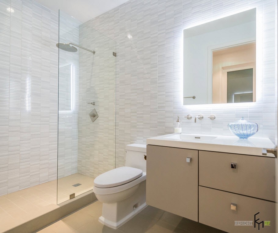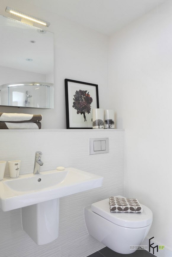 Интересными кажутся композиции с введением серого или кремового. На своем фоне они деликатно растворят мрачность, и убавят яркости. Дизайн комнаты станет мягче и спокойнее. Цвет белой сантехники будет суммироваться со светлыми акцентами и идентичными тонами на мебельных поверхностях