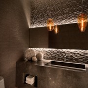 Изобилие стройматериалов побуждает к действиям. Сложно устоять перед искушением иметь натяжной пол с объемным изображением, поклеить шелковые обои или расположить красочное панно с морским пейзажем за унитазом. Панорамное изображение ночного города в сопровождении подсветок не требует комментариев. Идея с фотообоями – это отдельная глава и беспроигрышный вариант для украшения. Любая картинка с помощью света создает цветные иллюзии, и вызывает эмоцию восторга.