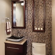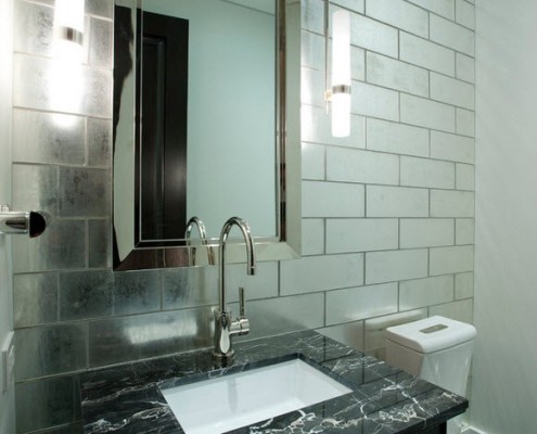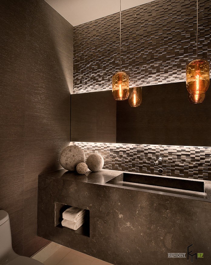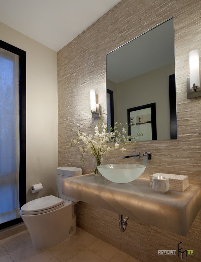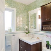 В одной вариации ритмичную укладку допускается ограничить фартуком или симметрично распределить плитку вокруг зеркала, оставляя преимущество за светлой поверхностью. Удачной считается двухцветная компоновка в одном сегменте. Широкие темные горизонтальные панели, в тандеме устремленных кверху полос, смотрятся актуально и по-современному.