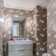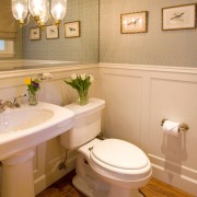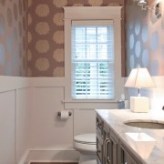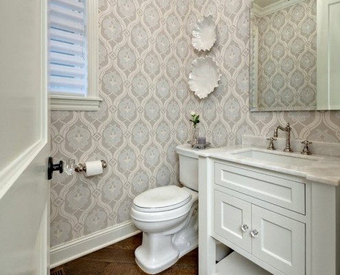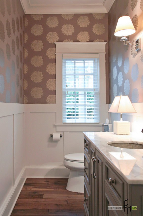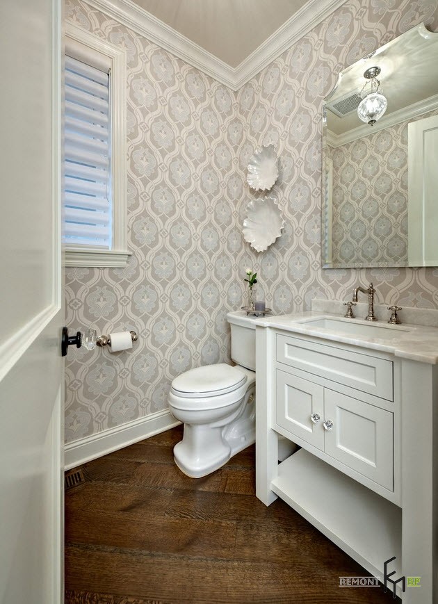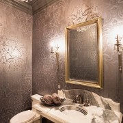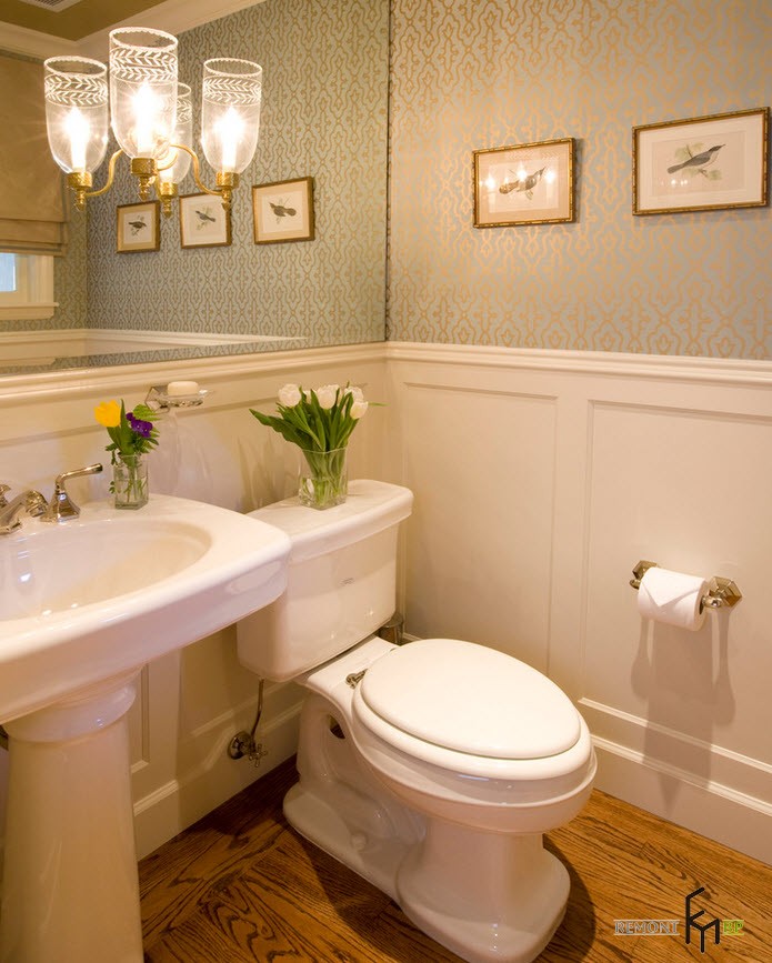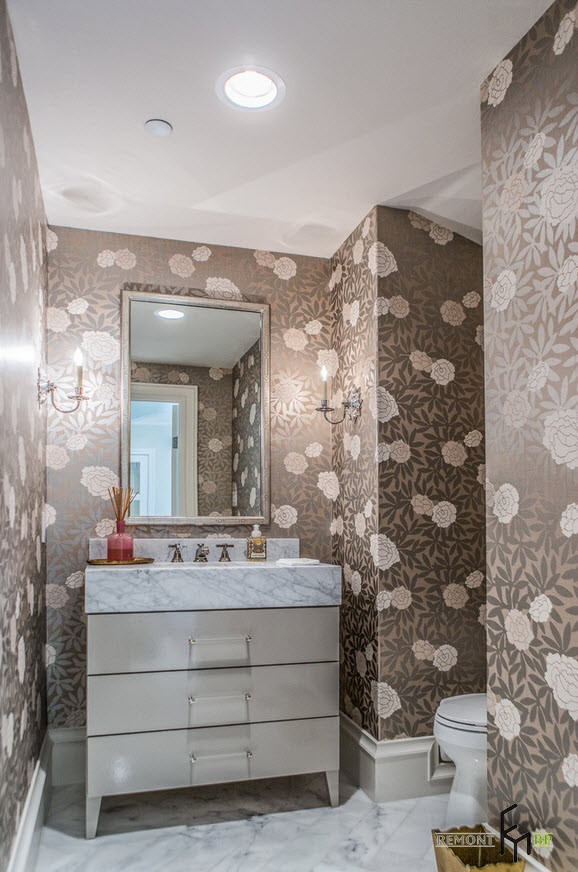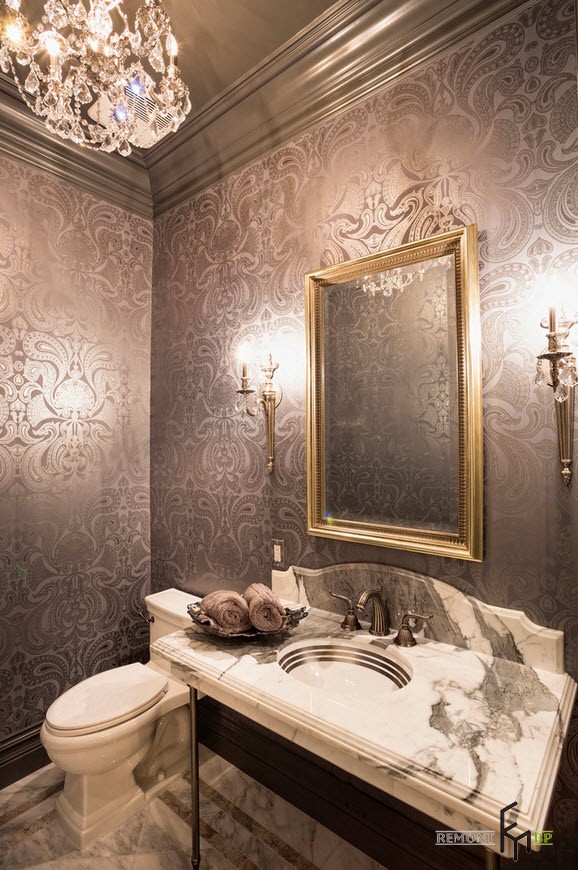 Английский стиль подразумевает роскошь и величественность, и не зависим от метража. Остановитесь в выборе на плитке с тематическим рисунком со штрихами золота, серебряными вкраплениями или светлой отделке. Заурядная поверхность засияет в соседстве принтов с золотыми фризами. Добавят роскоши мрамор или его имитация. Рациональная альтернатива – влагостойкие шпалеры, наиболее часто применяемые для подобного декорирования или мозаичные версии. Темные обои с барочными рисунками по соседству с овальной формой ретро-абажуров или светильники с хрустальными подвесками выглядят превосходно.