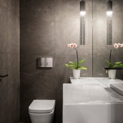 Глянцевый потолок за счет светоотражающего эффекта, внесет значительные эстетические поправки. Выполнить его стоит даже не в белом, а в кремовом или в цвете слоновой кости. В большой уборной лучше эксплуатировать не меньше 3 источников: общее, локальное и точку рядом с зеркалом.
