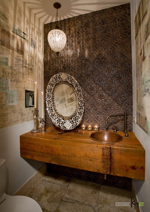 Стилизованный стол и пару подвесных открытых полок для приятных мелочей, зеркало в кованом ажуре и светильники в идентичном исполнении закончат сюжет. Для близкого по духу марокканского направления близка мозаика. Увлекшись ее яркостью, следует помнить о цветовом пресыщении, значительно скрадывающим пространство.