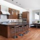 Большое значение имеет напольное покрытие. Белый кафель, с вкраплениями противоположного цвета, на фоне мебельных фасадов цвета венге, со столешницей из серого мрамора, выглядит дорого и торжественно. Вполне уместно чередование двух разноцветных квадратов небольших размеров. Крупный формат “срежет”периметр. Лучший вариант – облицовка «зеброй». В зависимости от направления дорожек, помещение вытянется или расшири