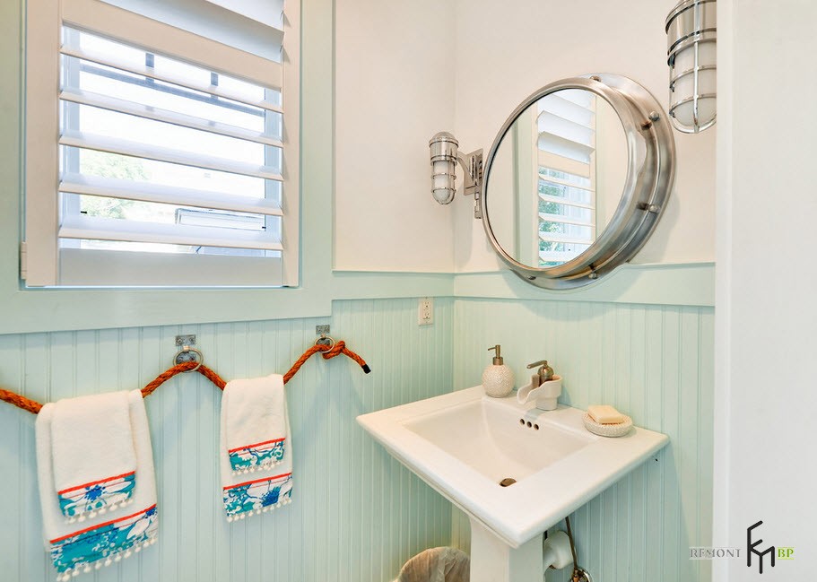 Цветовая палитра не ограничена, но совпадение с оттенками неба и моря, сезонными красками признаны оптимальным для декора. Приветствуются сегментные заставки из охры, весенней зелени, венге и крема. Фасады мебели выбираются гладкими или типичными для кантри – с легкой потертостью красок на состаренных поверхностях. Внимание направлено на скромное украшения сухими или живыми цветами. Природные мотивы отлично рифмуются с деревянными полками и полом и такими же держателями для текстиля. Совсем необязательно окаймлять зеркала оправой, однако принты в технике фьюзинг будут уместны.