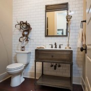 Для пола используйте деревянное покрытие или плитку с копией текстурного рисунка спила. Латунные и бронзовые смесители, гипсокартонные и натяжные потолки с фризами по периметру, как нельзя лучше подойдут для оформления. Зеркала подбираются непременно в золотых рамах и крупных форматах. Мебель на фигурных ножках темного или сливочного цветов с деревянными фасадами, сантехническая инсталляция прямоугольной формы с высоким бачком и крупной цепью, опять же из латуни, изогнутый умывальник в форме лилии, подчеркнут достоинства викторианской эпохи.