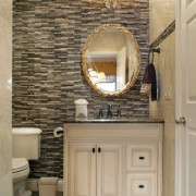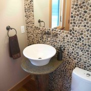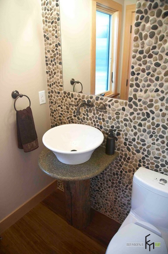 Выложенная на полу санузла цветная галька, повторяет морское дно. Оригинальная укладка симпатично сочетается мозаикой и удивляет многовариантностью ходов. Так, обрамление плитки галькой или ритмичное чередование разнотипных квадратов трудно назвать избитый схемой. Если перенести дизайн на стену, в гармонии ламината под цвет ореха композиция будет выглядеть естественно. В любом случае подобное оформление для эффектного восприятия требует свободы.