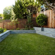 Такой забор имеет единообразную верхнюю линию, однако, все же желательно предварительно выравнить склон, используя завозной грунт. А смягчить монотонность капитального забора помогут высаженные вдоль кустарники и деревья, особенно, когда верхушки растений в нескольких местахпересекают кромку забора.