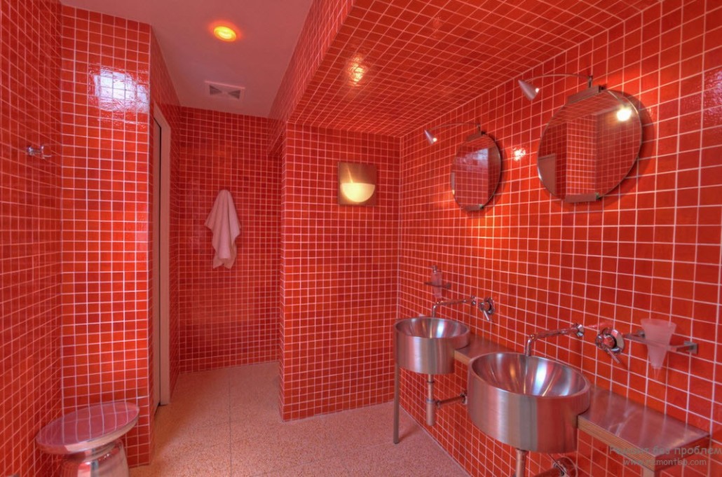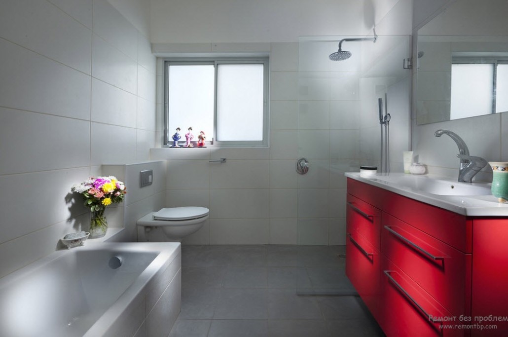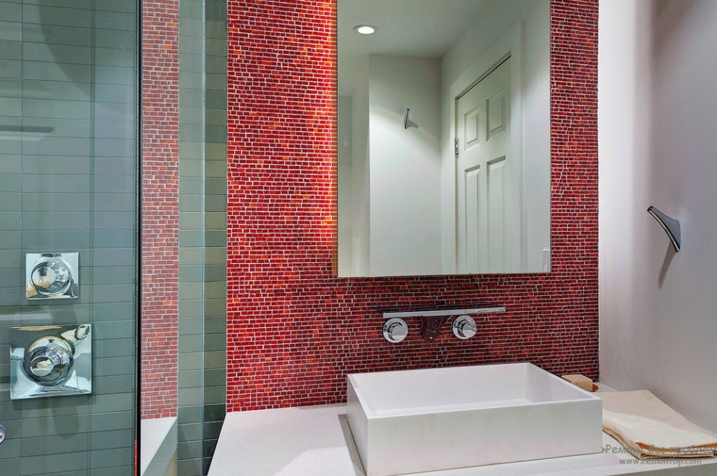 Известно, что красный цвет стимулирует физические и ментальные процессы, настраивает на активную деятельность наступающего дня. Так как мы проводим в ванной комнате не самое большее время суток, то можно поэкспериментировать с применением красного цвета в оформлении без опасения быстро устать от пребывания в подобном пространстве.