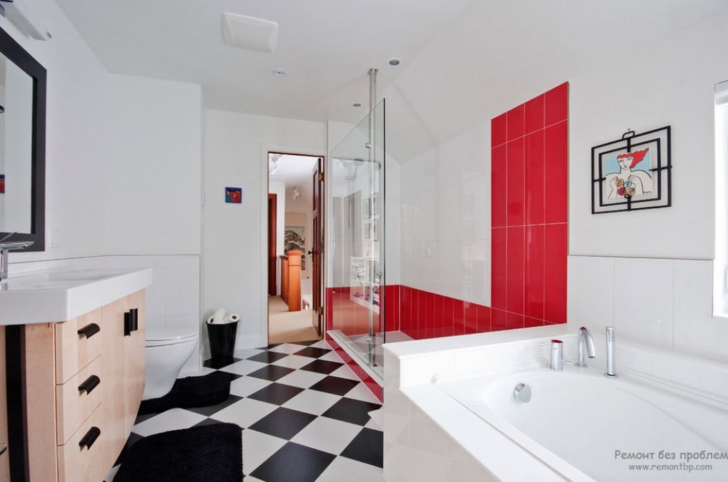 При достаточно большой площади целесообразно зонирование ванной комнаты на отельные части для ванной и туалета. Или, наоборот, в случае необходимости слить два отдельных помещения в одно, устранив разделяющую их перегородку. В белом цвете представлены овальная ванная и остальная сантехника, а также банные аксессуары. Чёрный пол и красная облицовка стен создают динамическое сочетание. Использование трёх цветов гармонично уравновешено и вызывает чувство эстетического удовлетворения.