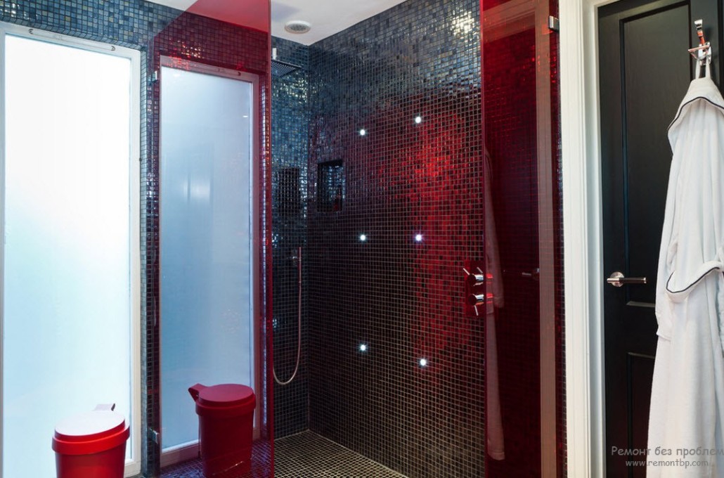 Красно-чёрная ванная комната, в которой расположилась сверкающая чёрная овальная ванна, развешены чёрные портьеры, а пол выложен крупной чёрной плиткой, будет смотреться идеально в сочетании с элементами обстановки нейтральных тонов – картинами, эстампами. Система иллюминации должна обеспечивать яркое освещение, в котором использованы естественные и искусственные источники. Такая композиция подойдёт для очень просторных помещений.
