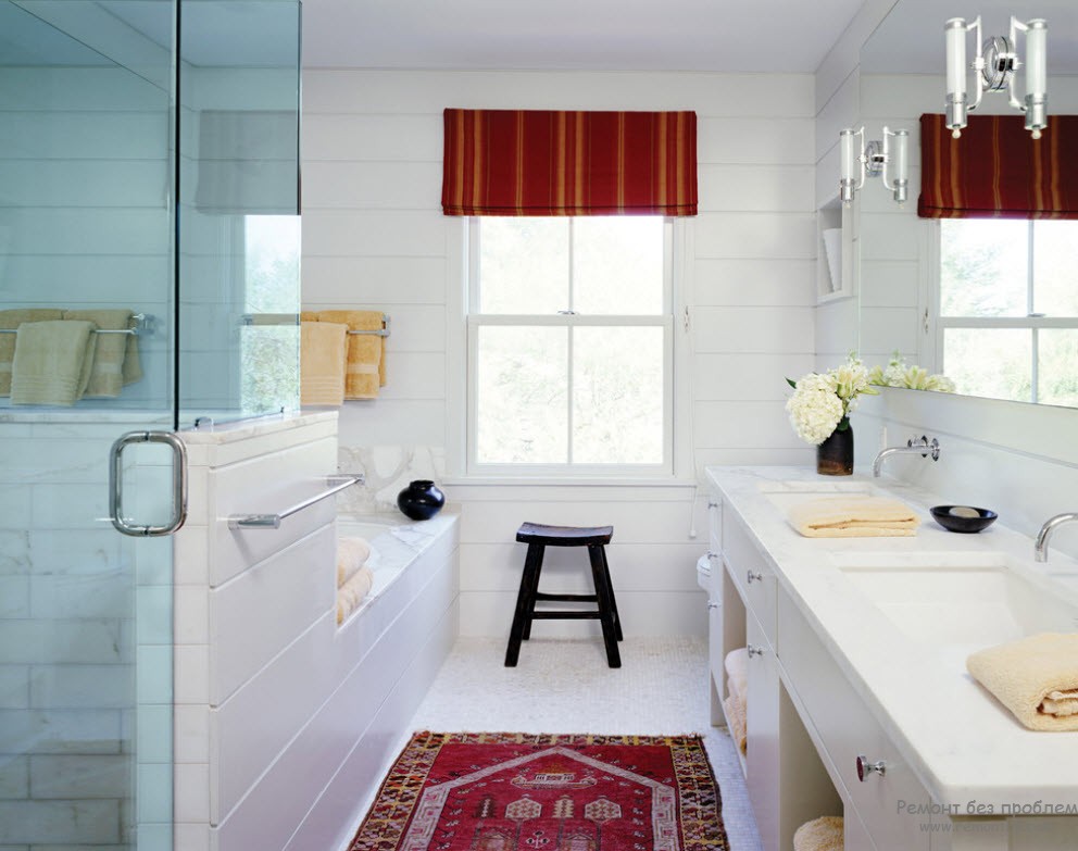 Чистота и сияние белой ванной комнаты может быть только подчёркнута сдержанным использованием красных тонов, которые нарушают монотонность белого и создают экстравагантный контраст. Для придания ноты изящества и гламура может быть использован светильник с хрустальными подвесками.