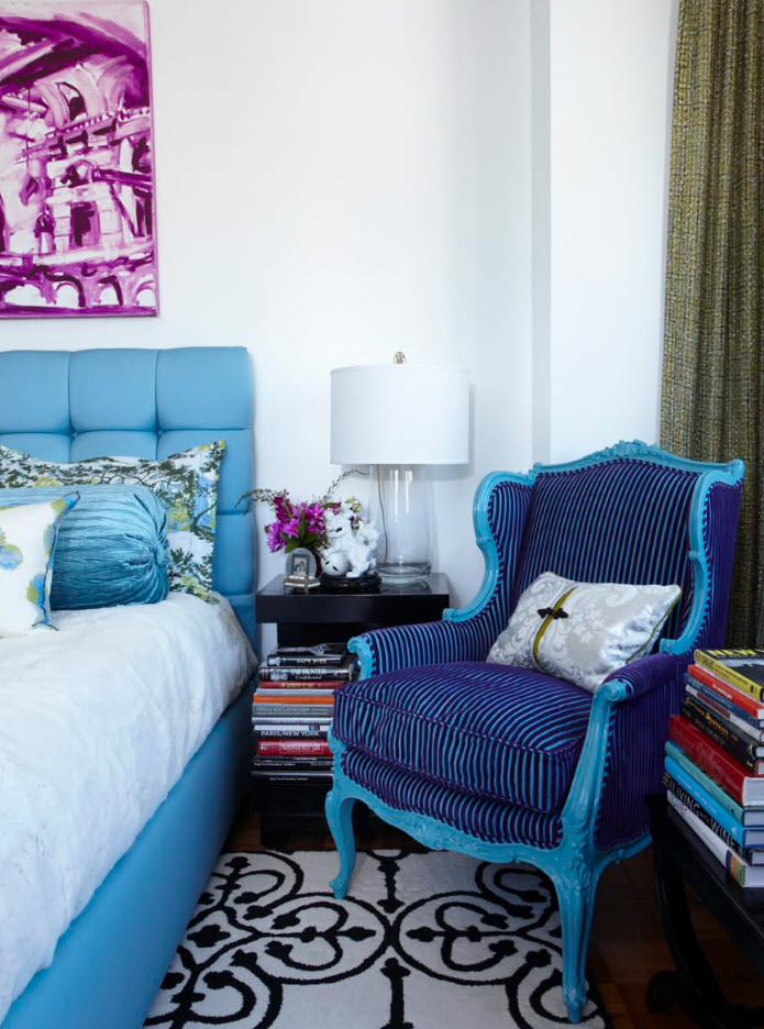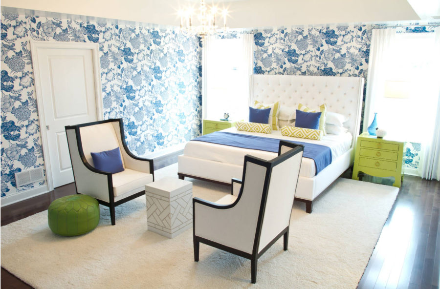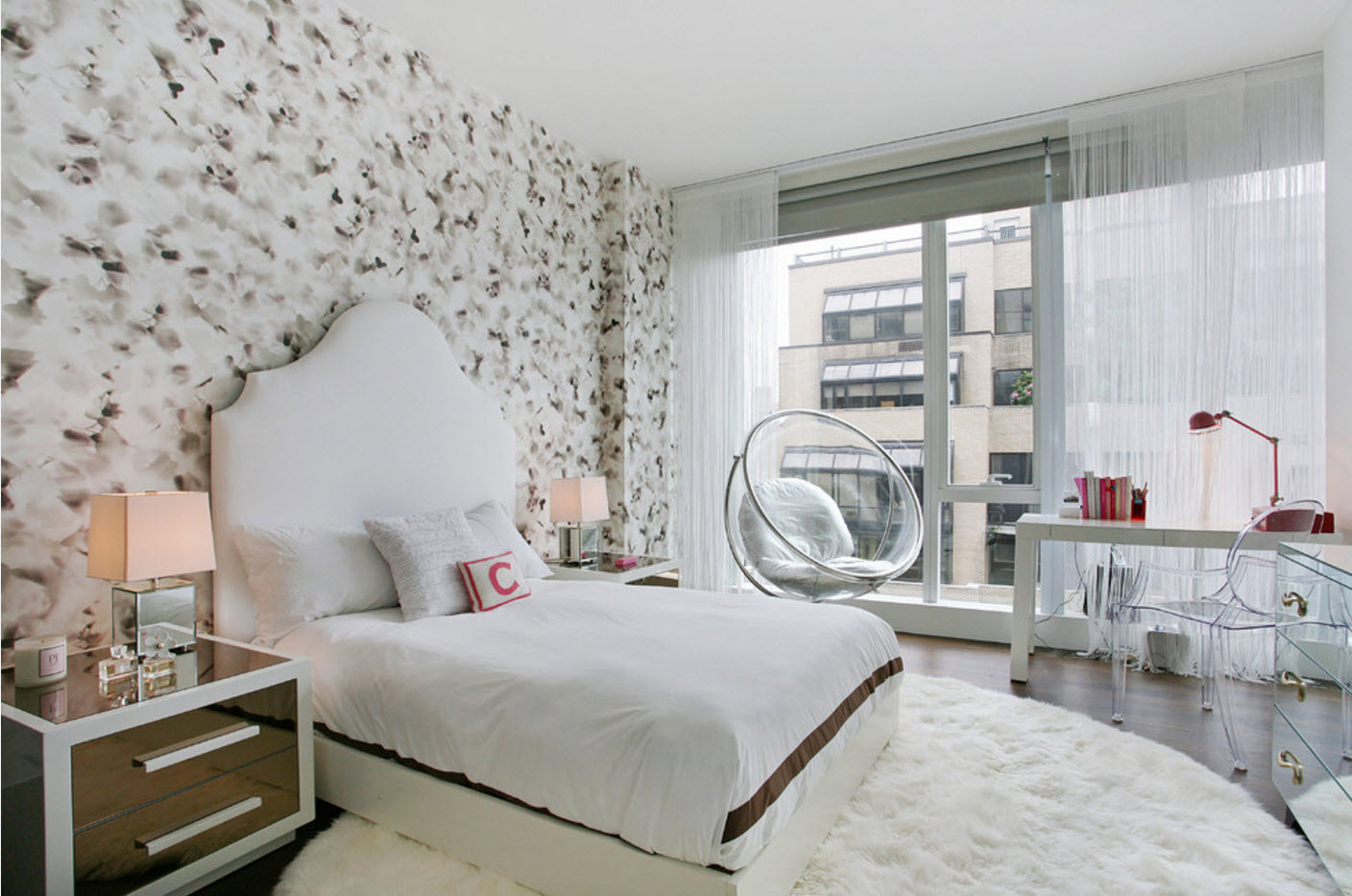 С помощью кресла наиболее просто привнести акцент в лаконичный дизайн спальни. Среди однотонных плоскостей в пастельных тонах именно яркое кресло может стать центром притяжения всех взглядов. Это может быть однотонная яркая обивка или пестрый принт, оригинальная фактура – меховой чехол, например.