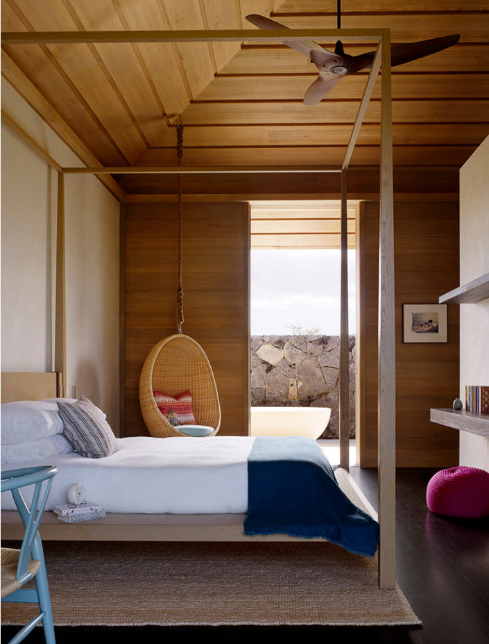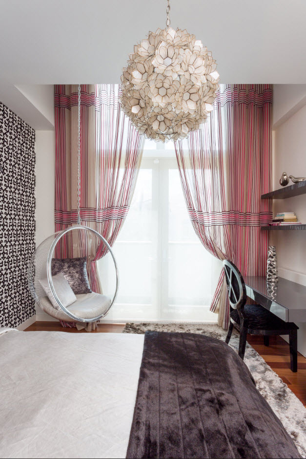 Один из вариантов исполнения подвесного кресла – плетеная модель, которая органично смотрится в спальне, оформленной в современном стиле, кантри, пляжной или тропической стилистике. Среди очевидных преимуществ подвесных моделей можно отметить то, что они практически не занимают полезного пространства комнаты и хозяева имеют возможность отдыхать в них, мерно раскачиваясь. Но и недостатки у таких моделей имеются – не каждый потолок готов принять достаточно серьезное крепление. Для комнаты с натяжными потолками подвесные конструкции являются табу.