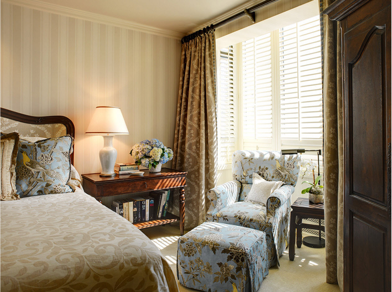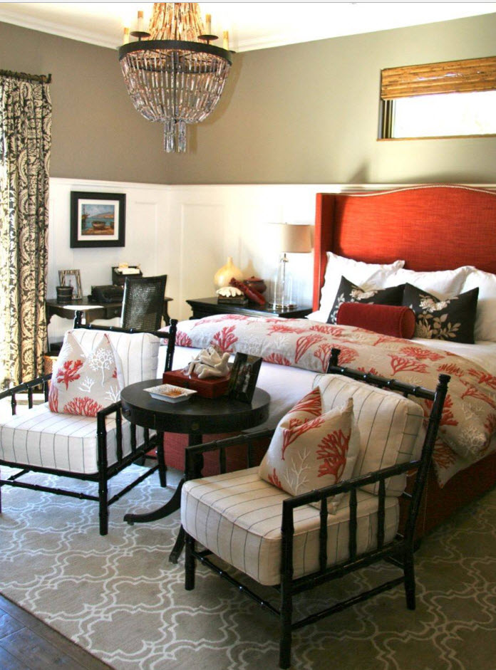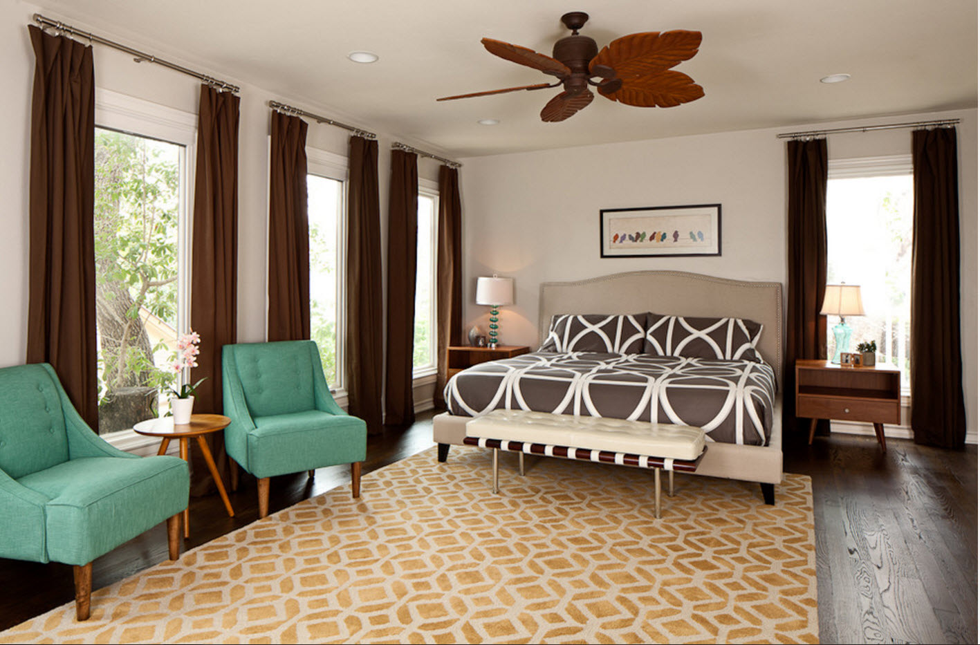 Обивка кресел под цвет штор или даже из аналогичного материала – известный дизайнерский прием, который помогает создать гармоничную картину спального помещения. Главное в этом случае – не переборщить с принтом. Если на мягкой мебели и в драпировке оконных проемов будет яркий, пестрый рисунок, то помещение рискует потерять свою индивидуальность. Важно не забывать, что в интерьере спальни, главным предметом меблировки все же остается кровать.
