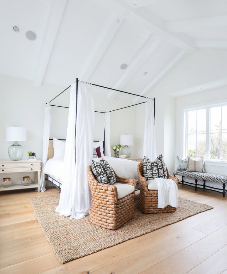 Плетеные кресла (частично или полностью) – выбор не для каждой спальни. Кантри-стилистика, пляжный, тропический, средиземноморский стиль отлично принимают в свои образы мебель, немного похожую на садовую. Оригинальный внешний вид и экологическая безопасность пойдут на пользу любому интерьеру.