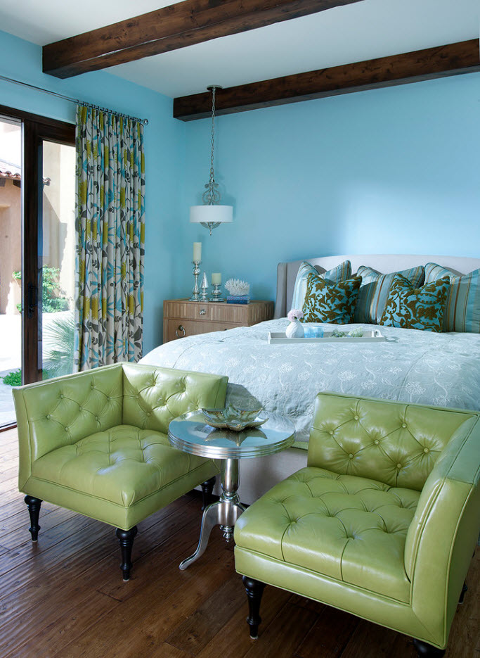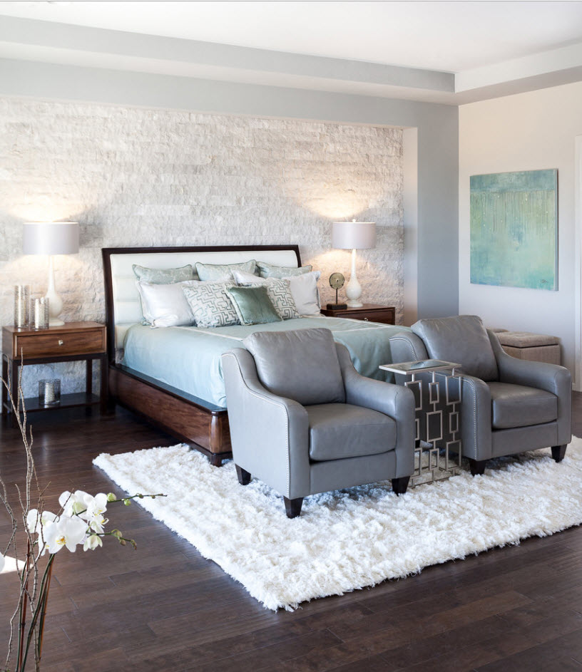 Для того чтобы организовать в спальне зону отдыха достаточно пары небольших кресел, журнального (кофейного) столика и локального источника освещения (в комнате с панорамными окнами можно обойтись и без него). Чаще всего такие кресла устанавливаются у изножья кровати. Но все зависит от объемов и планировки комнаты.