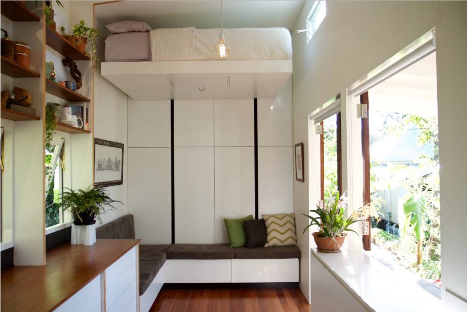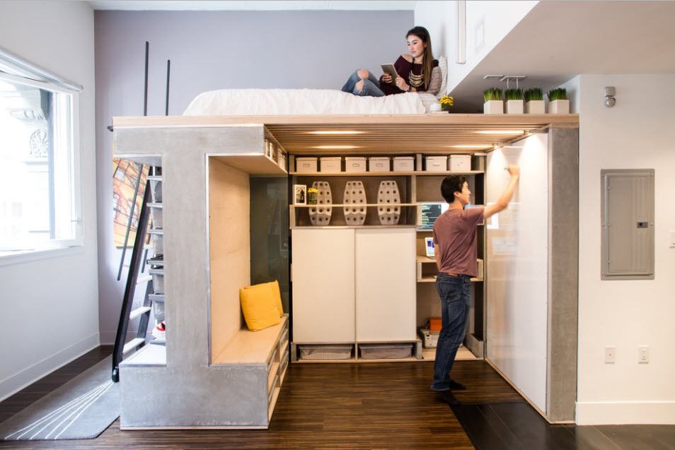 Мини-комната под спальным местом. Такой вариант возможен, если кровать двухместная, что позволит обустроить под ней отдельную компактную комнатку. Стены лучше делать раздвижными, а не стационарными.