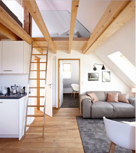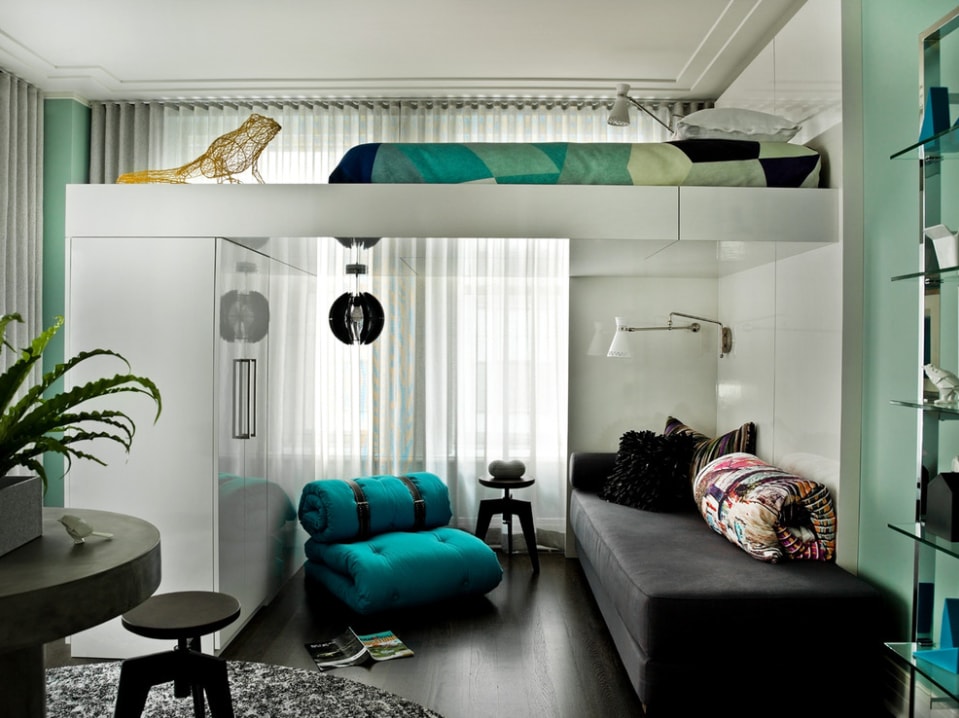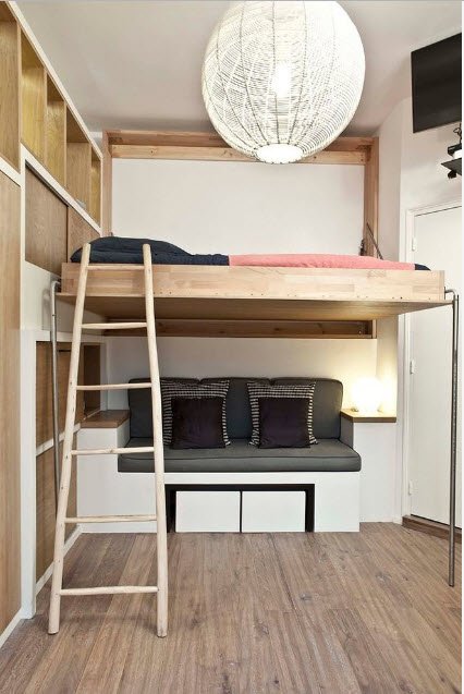 Зачастую кровать-чердак традиционно используется в детских комнатах. Но если стоит задача оптимальной организации небольшого пространства с несколькими функциональными зонами, такая мебель поможет сэкономить ценные квадратные метры. Более того, подобная конструкция смотрится очень стильно и современно.