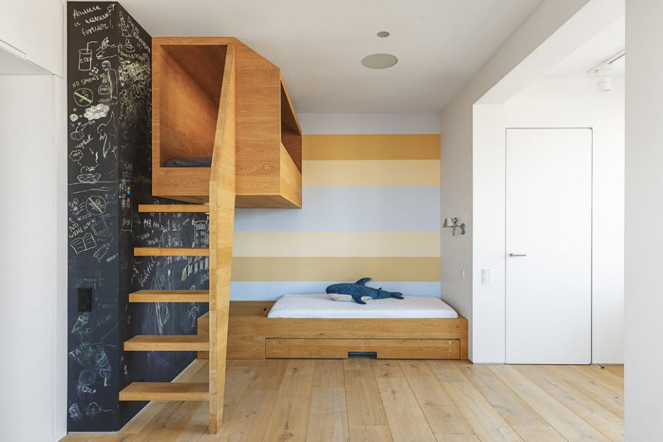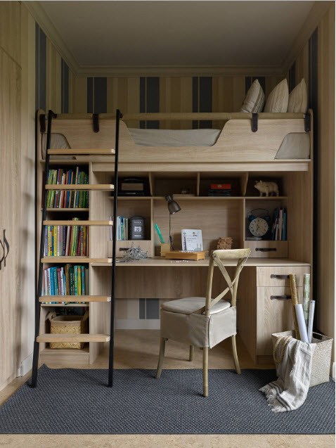 Вариантов дизайна и организации пространства под кроватью-чердаком масса, но прежде всего следует помнить о практичности, безопасности и комфорте пребывания в ложе на втором этаже.