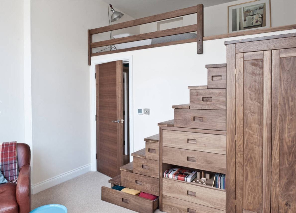 - кровать-чердак обычно располагается вдоль одной стены и может служить дополнительным местом хранения многих полезных вещей, в зависимости от вида лестницы;