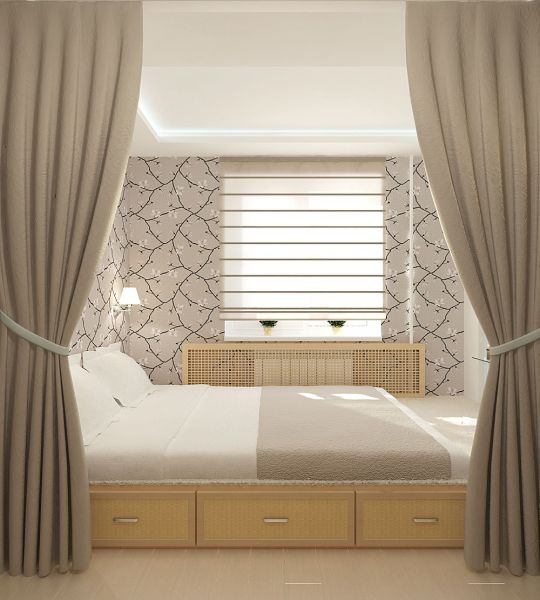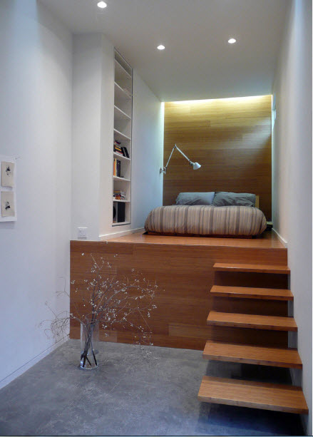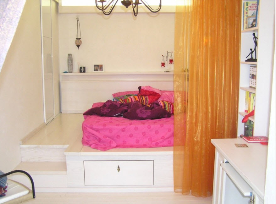 4.Кровать-подиум помогает экономить пространство. В малогабаритном помещении, где не хватает места для громоздкого шкафа, а также нет возможности обустройства отдельно спального места (кровати) и зоны отдыха (дивана), конструкция подиума поможет выполнять несколько функций одновременно.