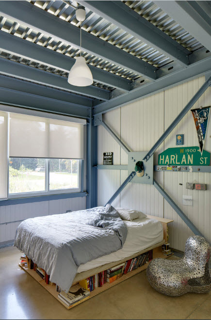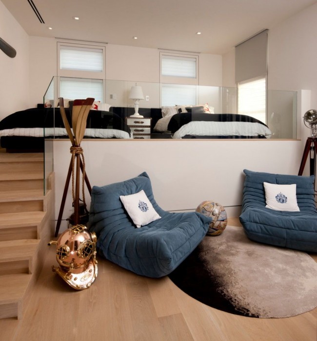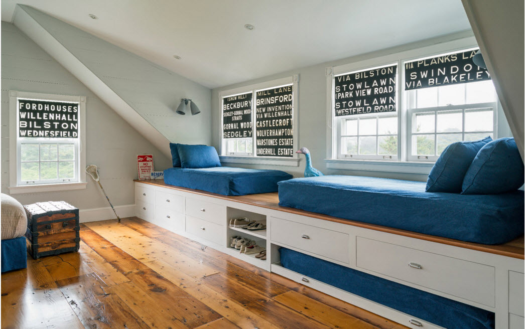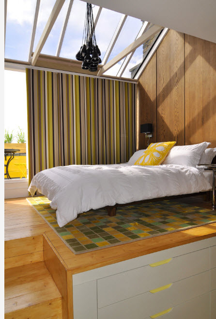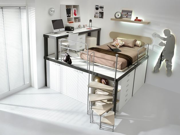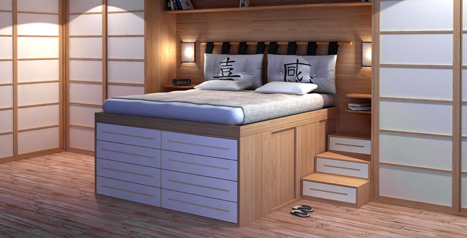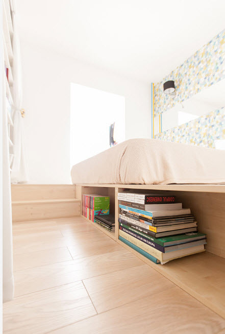 3.Многофункциональность сального места, расположенного на возвышении, связана, прежде всего, с возможностью обустройства большого количества вместительных систем хранения. В зависимости от размеров спального места (односпальный или двуспальный матрас расположен на возвышении), пространство подиума можно превратить от вместительного комода до полноценной гардеробной. При этом может использоваться система с откидным полом (встречается редко) или выдвижными ящиками, распашными дверцами (наиболее популярный вариант).