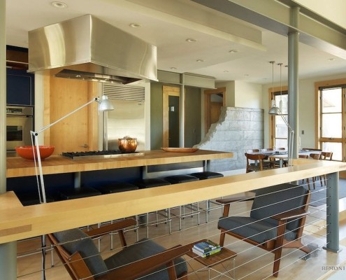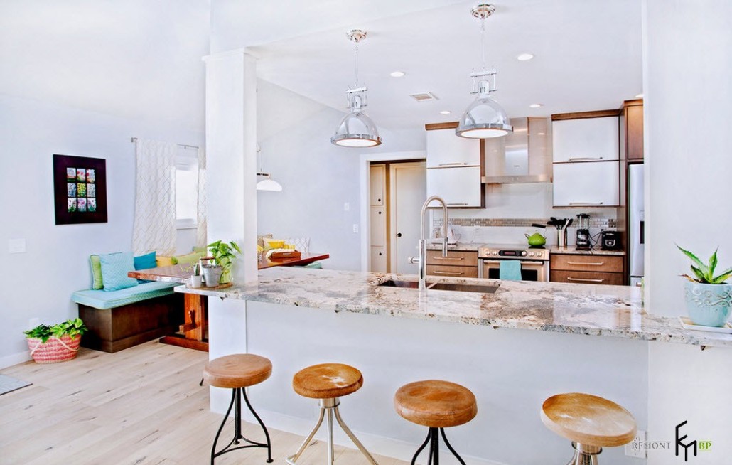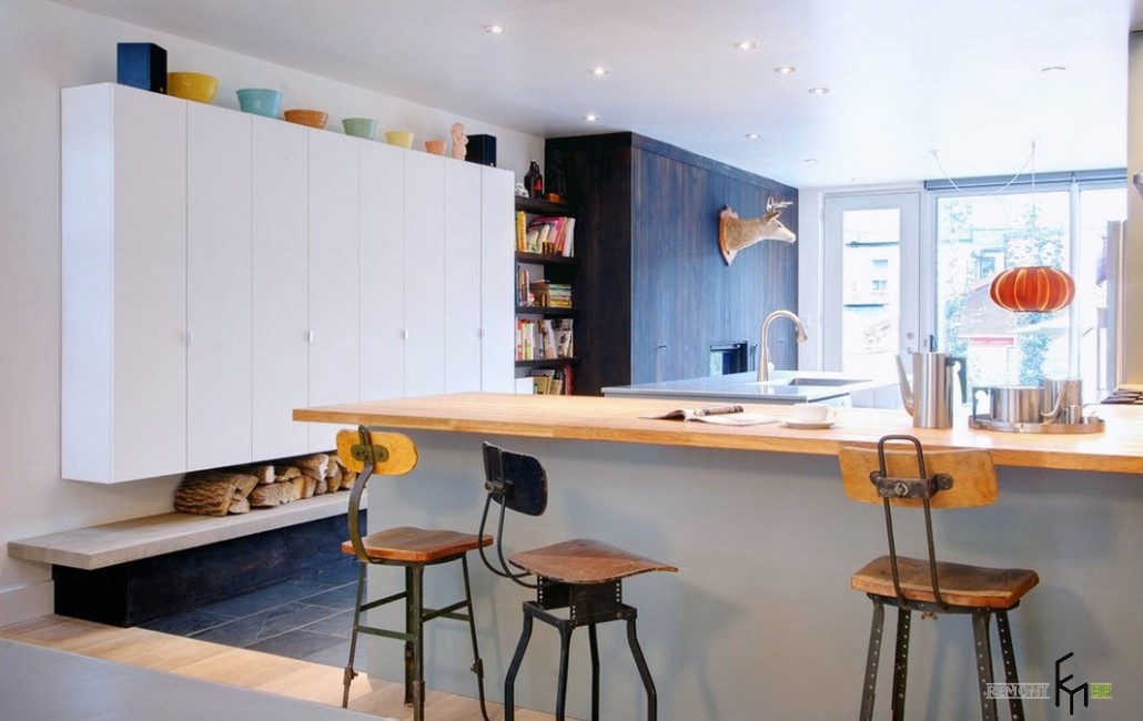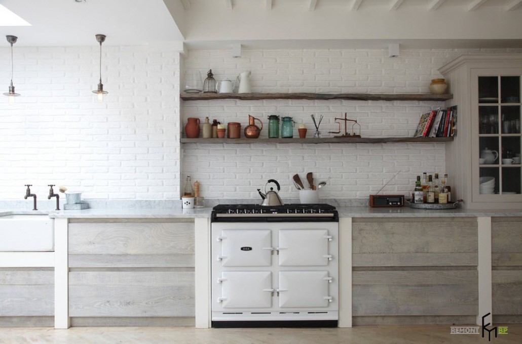 Комбинирование дерева и камня – это один из дизайнерских приемов. Очень удачным решение будет выложить натуральным камнем или кирпичом стену в рабочей зоне кухни: