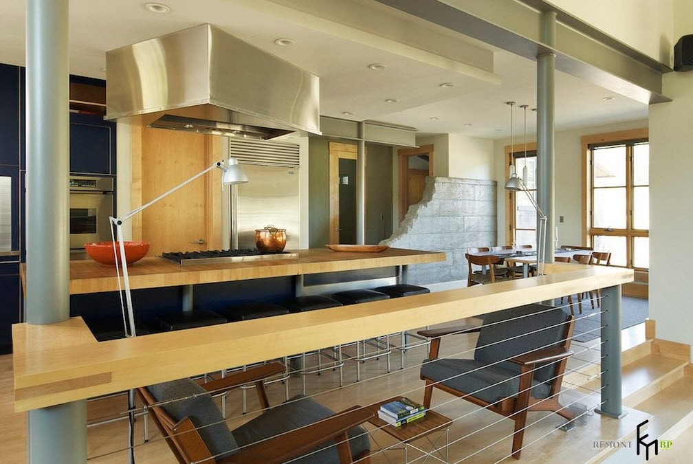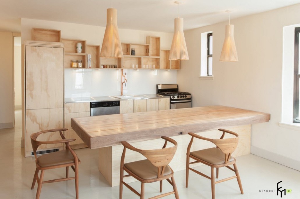 Отдельное внимание в кухне уделяется обеденному столу в зоне приема пищи. В соответствии с народными традициями, стол должен быть деревянный и большой, за которым смогла бы разместиться вся семья. Вполне подойдет П-образная форма из древесины с сохраненной текстурой дерева: